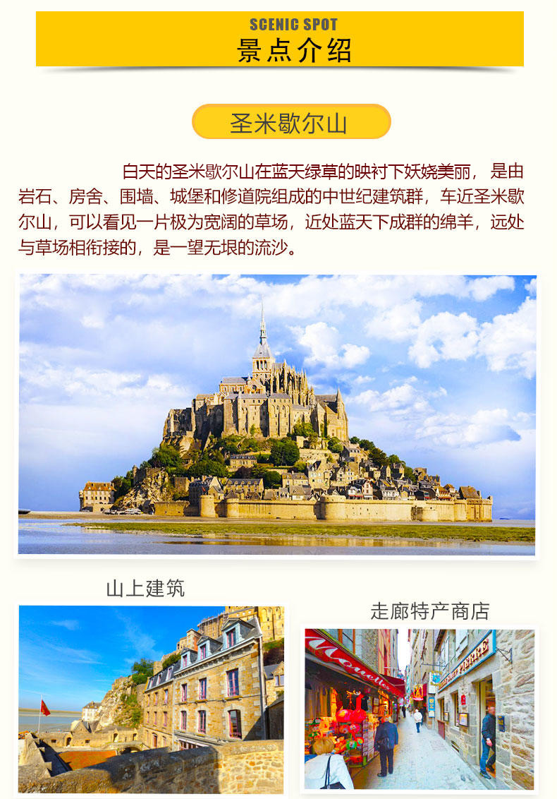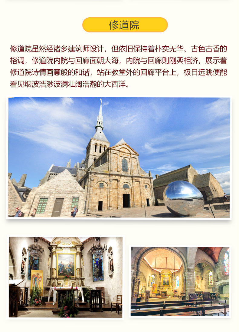 圣米歇尔山(Mount-Saint-Michel and its Bay)是法国著名古迹和天主教朝圣地,是天主教的第三大圣地。1979年,圣米歇尔山及海湾被联合国教科文组织列入了世界遗产名录。山顶建有著名的圣米歇尔山隐修院。公元8世纪,红衣主教奥贝为奉献给天使长米歇尔所建,成为朝圣中心,故称米歇尔山。