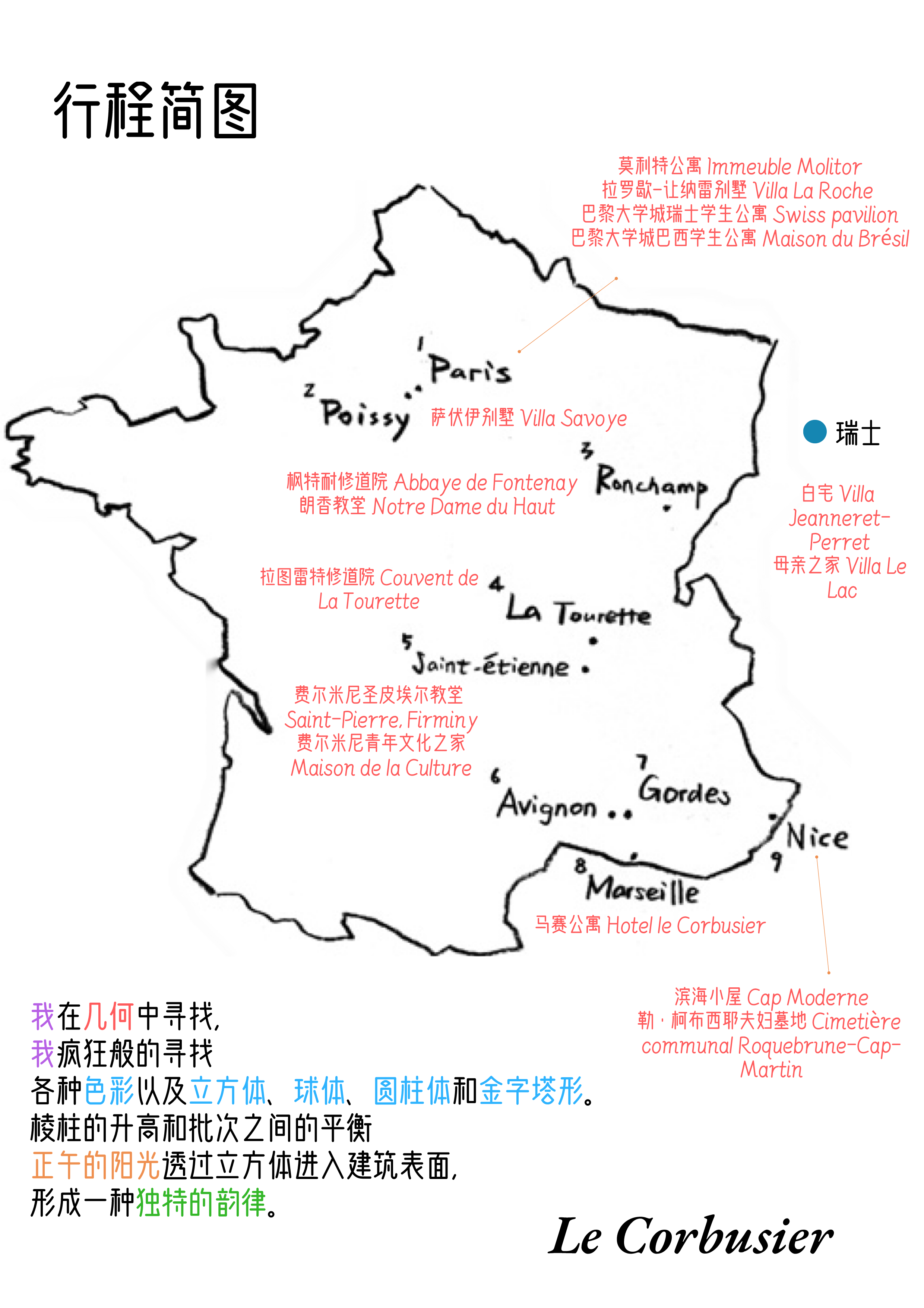 2. 线路中标注的柯布西耶建筑入住地,6-10月旺季房源紧张,如需大量房源,请提前4个月联系客服报价。