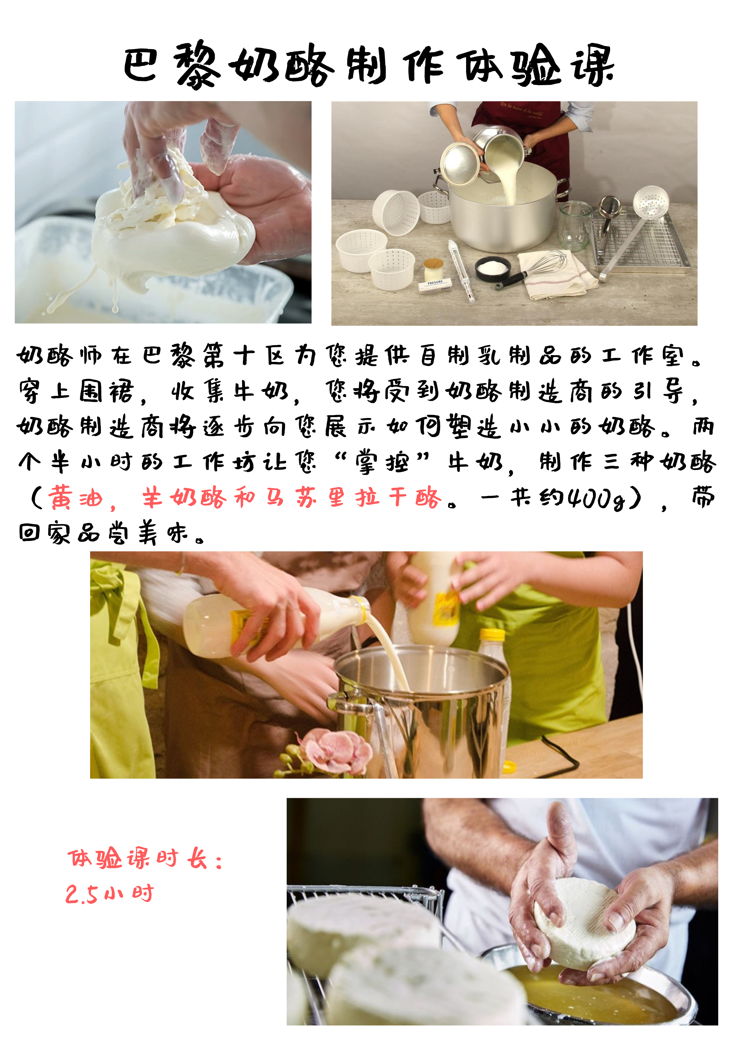 两个半小时的体验课程,亲手制作三种奶酪,带回家并品尝它们。