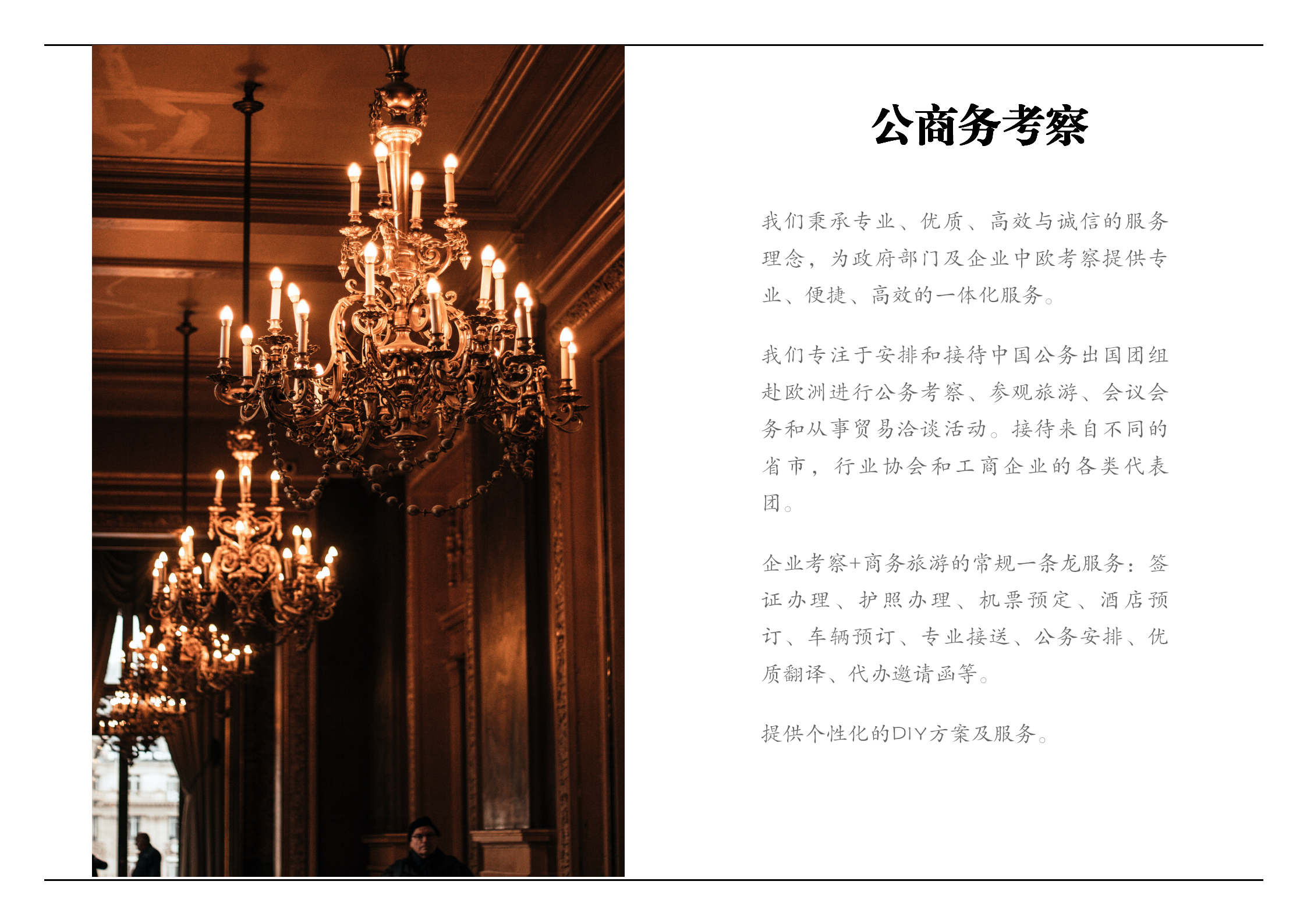 欧乐途秉承专业、优质、高效与诚信的服务理念,为政府部门及企业中欧考察提供专业、便捷、高效的一体化服务。